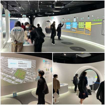 津波高潮ステーションでの見学の様子です。そろそろどの班も各施設の見学を終え、学校へ向かうところです。 -