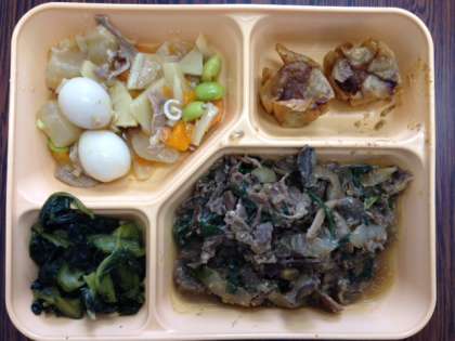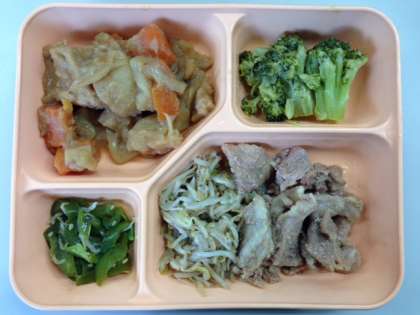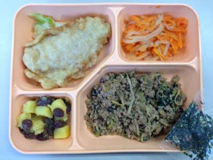写真右下の肉炒めと右上のナムルをごはんに混ぜて、のりをかけていただきます。