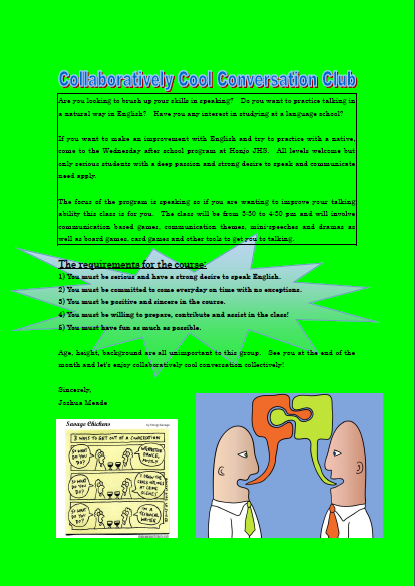今月末から,本館西1F多目的室でJoshuaによる『Collaboratively Cool Conversation Club』を開きます。詳細については文書で案内しますが,やる気があれば,何年生でも,どのレベルでも,保護者の方でも参加OKです。