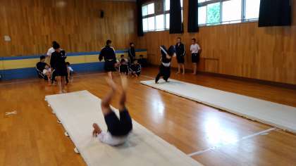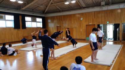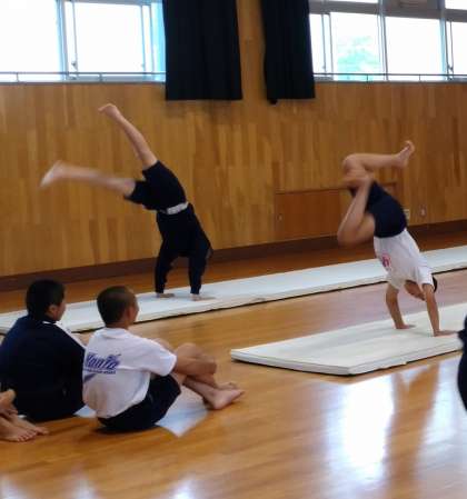 側方倒立回転や倒立前転など、しっかりとした体幹を育成していきます。 -