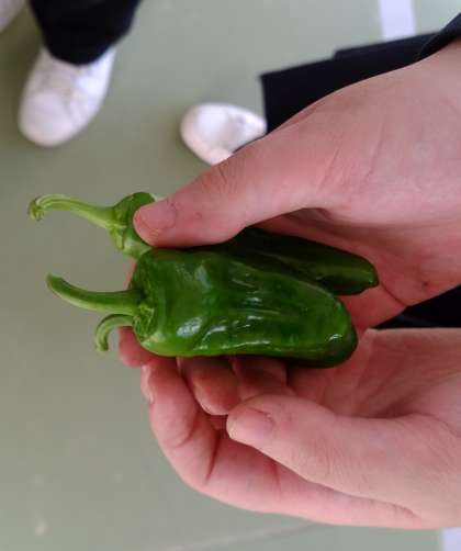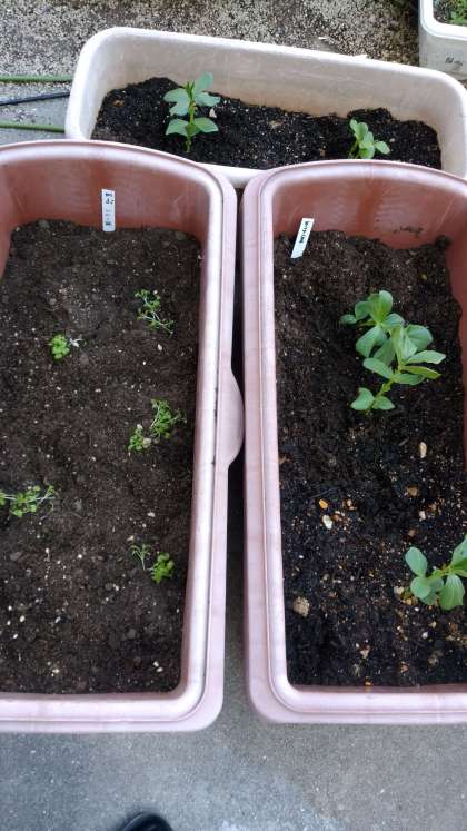 小松菜やそら豆の苗をプランターに植え替えたり、ピーマンを収穫しました。 -