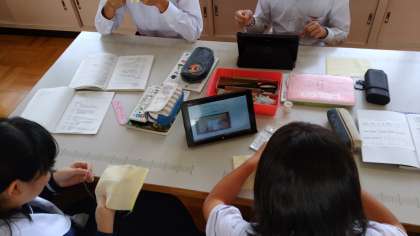 タブレットに作業工程のビデオを観ながら自分の手の動きと見比べながら作業を進めています。 -