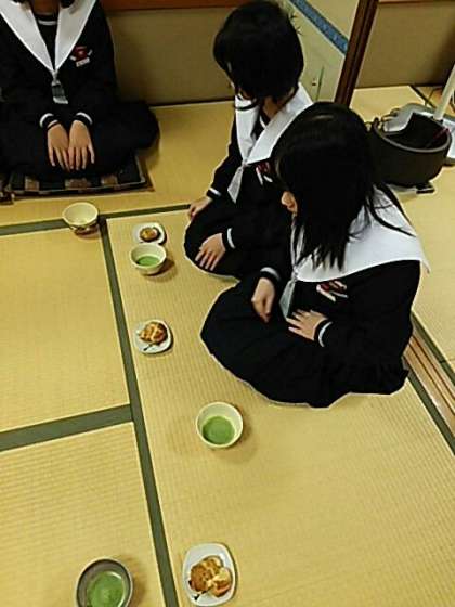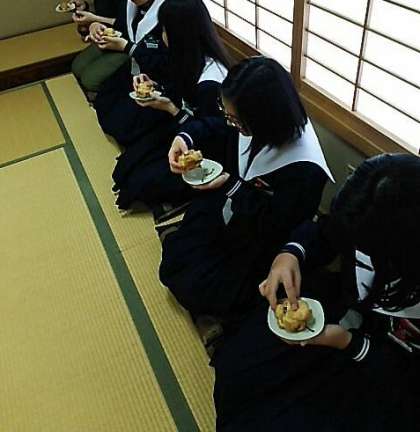 茶道部は家庭科部と一緒に作ったシュークリームとお抹茶をいただいています。