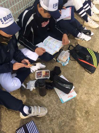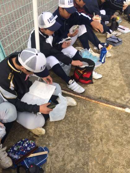 現在軟式野球5B代表選手は勉強しながら昼食を取っています。