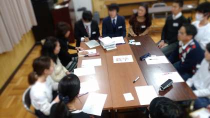 小学校と中学校の先生方が、教科に分かれて、熱心にお話されています。