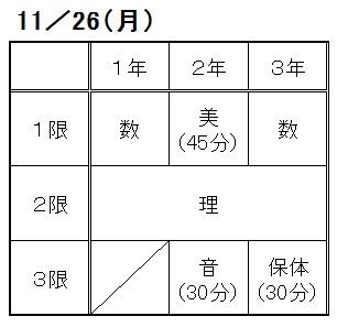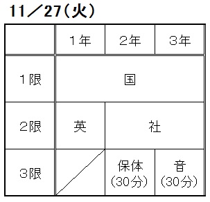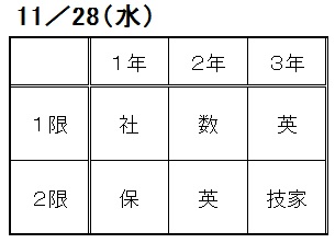 来週から始まります、2学期期末テスト1日目の時間割を添付します。 -