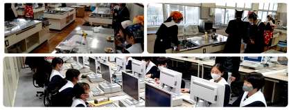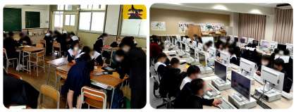 クラスを技術と家庭科の半々に分割して三蜜を避け、技術ではプレゼンテーションのスライド作り、家庭科ではみたらし団子の調理実習を行っています。