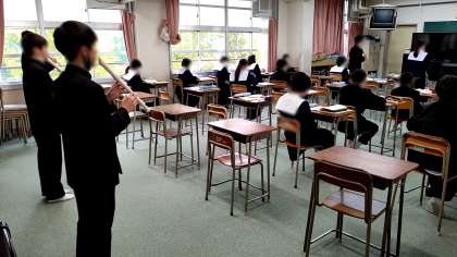 先週行った期末テストが返却され、解説やポイントを聞いています。
