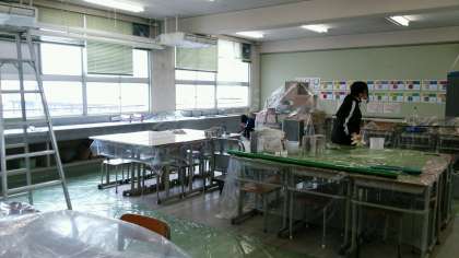 美術室の壁を塗りなおそうと,管理作業員さんが養生していると,2人の生徒が手伝いたいと。断る理由がございません。どうぞどうぞでお願いしました。新年からはきれいな美術室で,今度は絵を塗ってください。明日も続きがあるそうです。他の人もやってみたかったら,どうぞどうぞ。