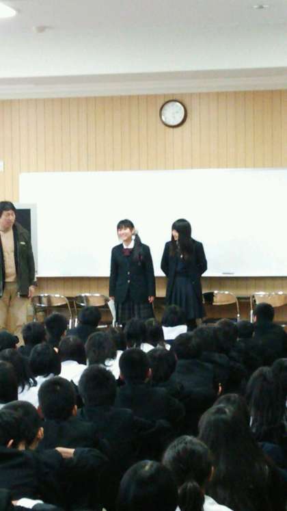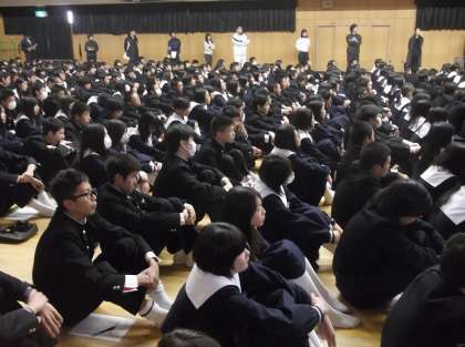 2年の3学期は『3年生の0学期』ということで,進路に興味を持ってもらうため,2年生対象に卒業生による進路講話をおこないます。今日はその第一回目ということで,私立高校代表として,常翔学園薬学医療進学系コース桂田さんと薫英女学院国際・英語進学(2年から文理特進)大浦さんに話をしてもらいました。2人とも高校の試験中なのに二つ返事で引き受けてくれて,ありがとうございました。