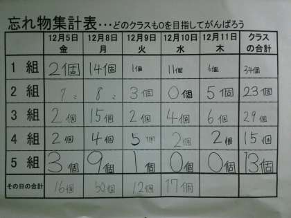 「忘れ物をなくそう」という1年生学級委員長会からの提案だそうです。全欄が0になるように,しっかり注意してください。