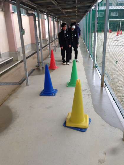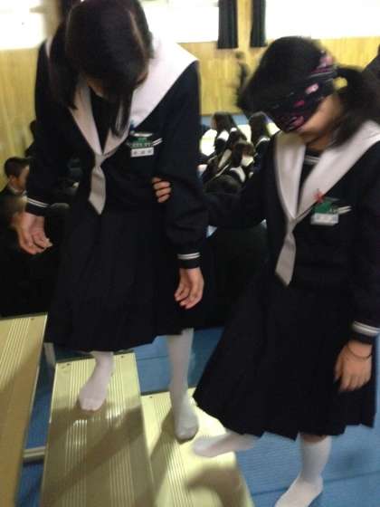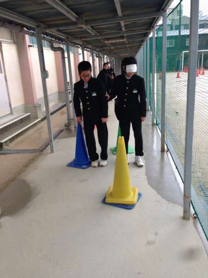 2年生では人権教育の一環で,12月3日から5日までの3日間,視覚障がいについて学びます。初日の昨日は,「視覚障がいについて」と「目の不自由な人への接し方」を学び,今日はアイマスク体験をしました。ペアで交代でガイド役とアイマスク役に分かれて,障害物のある場所を歩いたり,階段の上り下りをしました。