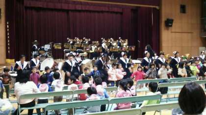 保育所や幼稚園の子が来ると知っていたので,『妖怪ウォッチ』を選曲してくれていました。保育所の子らは喜んで踊ってくれていました。中学校の吹奏楽部のコンサートはよくありますが,保育所の子どもたちが一緒に踊れるコンサートは経験したことがありません。本当に良かったです。