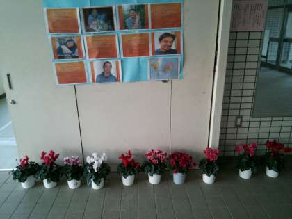 花の方は,正門に置いていたものですが,陽当たりが悪く弱っていたので,お湯につけて,校舎内で養生しています。