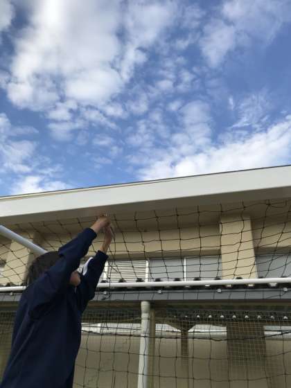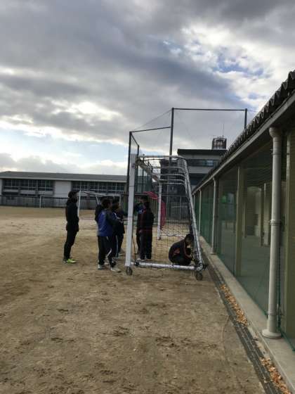 サッカー部が塗装を終えたゴールにネットをかけてます。こうしたことを通じて、生徒達はは、ものを大切にする気持ちと人の温かみを感じてくれます。 -