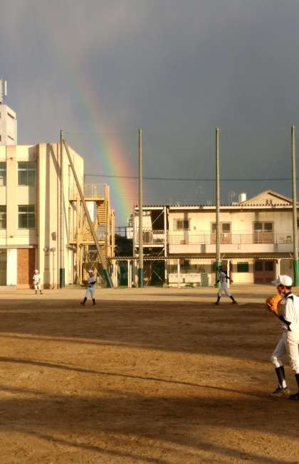 野球部の練習を見ていると、北西方向に大きな虹が出ていました。 -