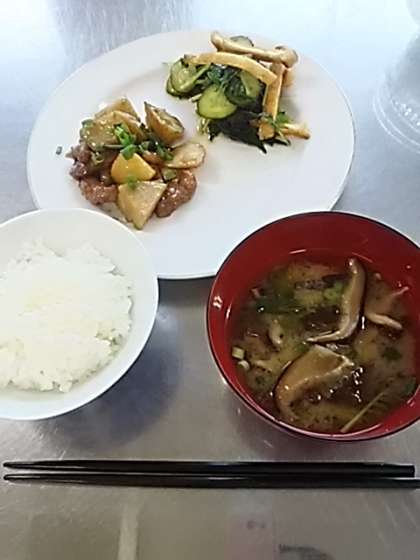 メニューは里芋と豚肉の照り焼き煮、うすあげと水菜のサラダ、味噌汁 ご飯 です。