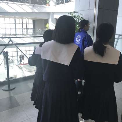 大阪府立体育館で行われている大会の練習会場として本校体育館を使っていただいています。体格も違いますが、柔軟運動や準備運動など、体の使い方はとても参考になります。