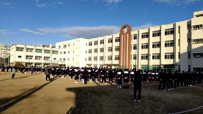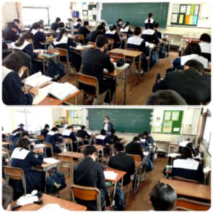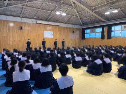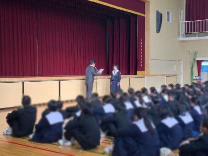 授業後、各学年で集会を行っています。3年生ではこれまでをふりかえり、年明けの進路の話をしたり、2年生では3年生になる準備期間としての3学期を迎えるためにどんな心構えが必要なのか有志による劇で分かりやすく伝えたりするなど、今年の総括をしたり、休み中の学習や過ごし方について考えています。
