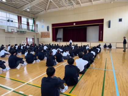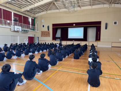 集会では、奨学金制度に関する説明や、今後の高校見学に関する連絡があり、生徒たちは進路に向けた準備の第一歩として、真剣な表情で話を聞いていました。