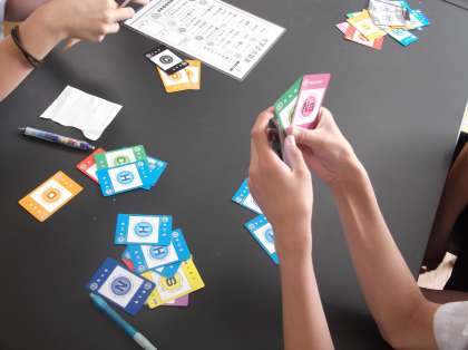 理科の授業では、化学式を学習していきます。まずは結合を理解することを目的にトランプのようにして学習を進めています。 -
