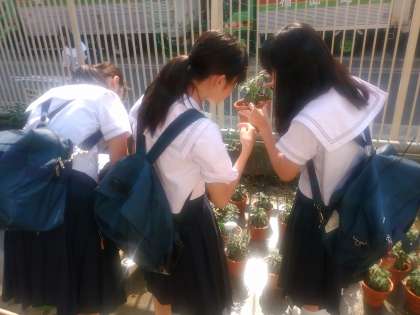 2年生で栽培しています「ミニトマト」が小さな実をつけました。まだ青く、探さないと見つけられないような大きさですが、大切に育てて、しっかり観察している生徒はとても喜んでいます。 -