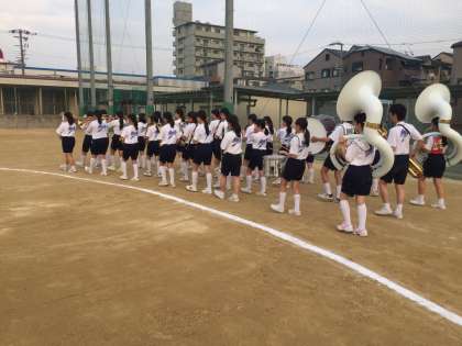 グラウンドのクラブ活動の練習を6時までとし、吹奏楽部のマーチング練習をしています。