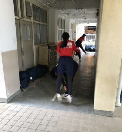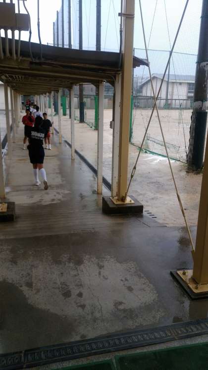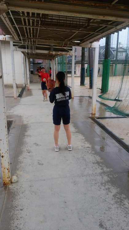 グラウンドは雨で使えません。渡り廊下ででもキャッチボールをしているソフトボール部です。