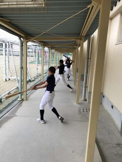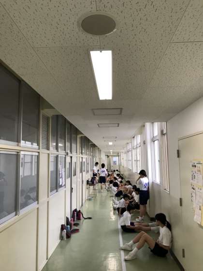 グラウンドが使えないので、校舎内を使って筋トレなどを行う運動部員達です。写真は野球部とソフトボール部。 -
