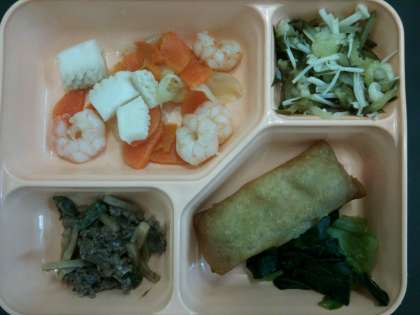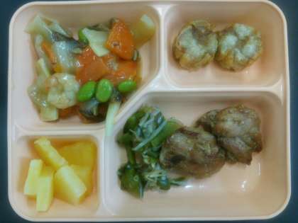 副菜の中にある白豆は,以前のメニューで調理ミスにより配膳されなかったものを,今日に回したものです。