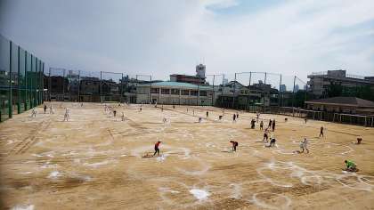 各部活動の部長が集められ、これからの部活動について説明を受けました。そのあと、グラウンドを使う部活動でグラウンドににがりを撒いて整備をしてくれました。
