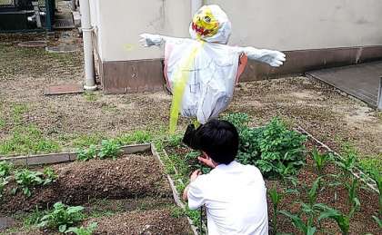 今朝は、成長してきた畑の植物が鳥などに襲われないようにと生徒が案山子を作ってくれて、それを畑に立ててくれました。