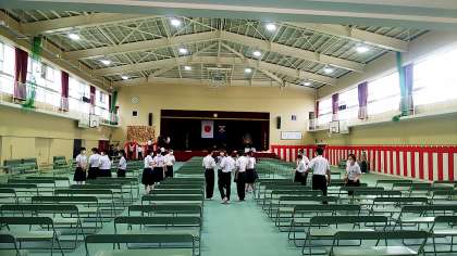 昨日のうちに3年生が中心となり、1年生の入学式の準備をしてくれました。1年生も説明を受けて準備万端のようです。