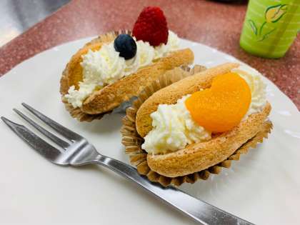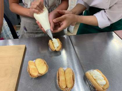 仕上げのホイップをキレイに絞るのはとても緊張しました。お菓子が出来上がるのは楽しいです。 -