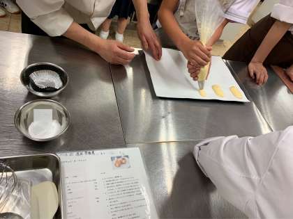 全体の説明を先生がしてくださった後、各テーブルで製菓科の生徒さんが丁寧に指導しながら実習しています。 -