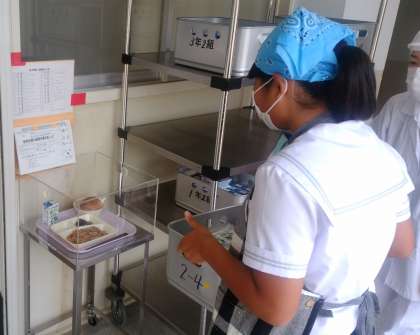 教室では、配膳を待つ生徒、給食係は配膳の準備をします。 -