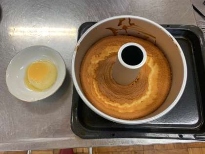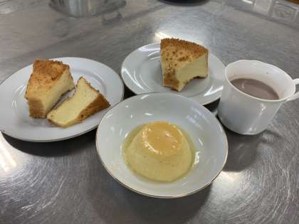 本日家庭科部は調理実習でシフォンケーキとプリンを作りました。
