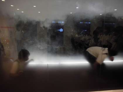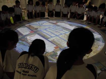 南海トラフ地震が起こったときを想定して私たちが住んでいる大阪市はどのようになるのか、映像見て学んだり、火災が起こったときの煙を体験している様子です。