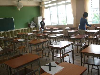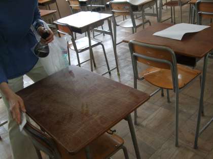 5月18日(月)に、5月になってから2回目の3年生の登校日がおこなわれました。前半組と後半組の間に、感染症対策のために先生が消毒をおこないました。