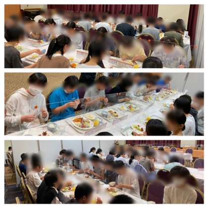 夕食は全ての席がパーテーションで区切られています。黙食でしたが、美味しくいただきました!この後は少し休憩しクラスミーティングがあります。今日、学んだことや感じたことをクラス内で共有したり、明日の連絡確認を行います。