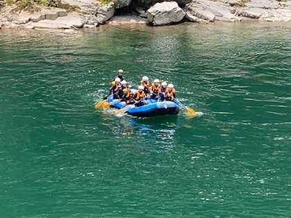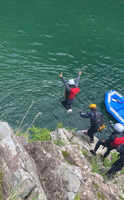 岩の上からジャンプ!怖い…と言いながらも勇気を出して飛び込んでいます。とても楽しんでいます!