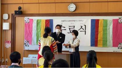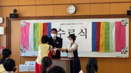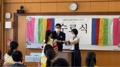 本日6時間目は、民族学級ウリマダンの修了式でした。3年間の学習を終え、3人のウリマダン生が修了証を胸に、これからも自分のルーツを大事に生きていくという決意の言葉を述べました。また、在校生からの贈る言葉や記念品の贈呈、最後はウリマダン生、保護者の皆さん、職員全員で記念撮影を行いました。修了生の皆さん、本当におめでとうございます!これからも民族学級で学んだことを忘れずに、誇りをもった人生を歩んでください。