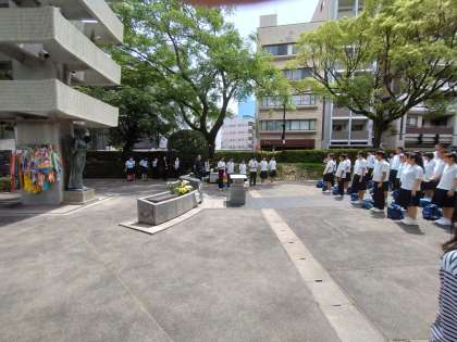 広島平和記念公園内でのセレモニーです。このあと千羽鶴を奉納しました。