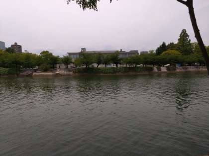 袋町小学校資料館から平和記念公園へもどる途中、川縁のベンチにて。ちょうど一つのグループが平和記念公園に向かいました。
