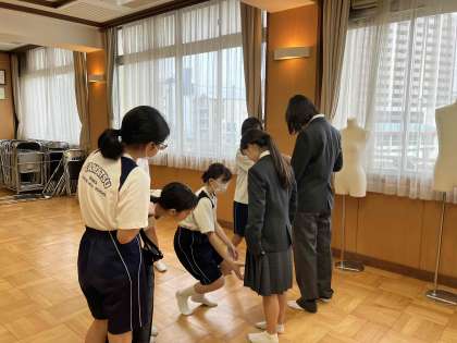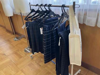 今日は、標準服のスカートとスラックスのデザイン選びをしています。検討委員会で3種類ほど選び、全校生徒のアンケートにてデザインを決定する予定です。