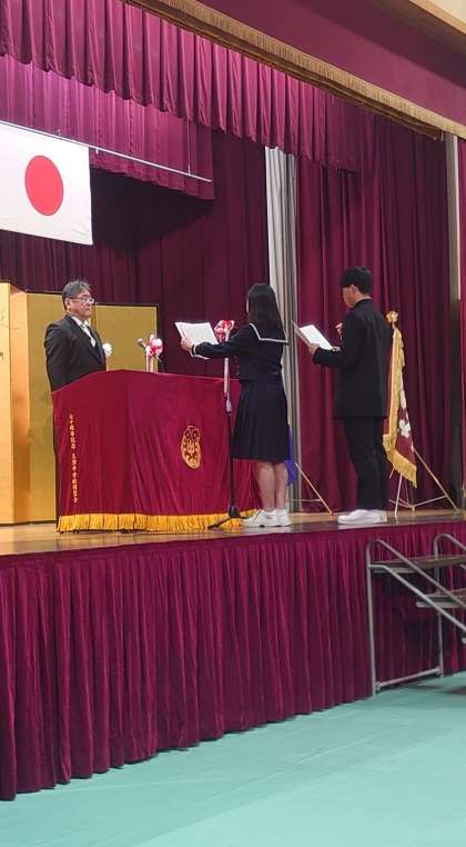 本日、第75回卒業証書授与式を挙行いたしました。保護者や来賓の皆さま、在校生に見守られて、3年生105名が玉津中学校を巣立っていきました。
