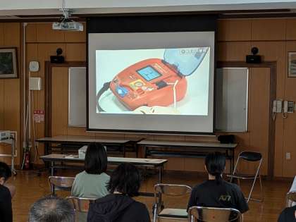 心肺蘇生の重要性や胸骨圧迫の行い方、AEDの使用方法などをDVDで確認し、人形とAEDのモデルを使って実技講習を行いました。