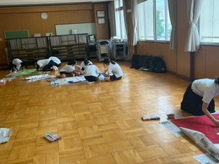 期末懇談の時間を使って、各学年で学級旗づくりをしています。