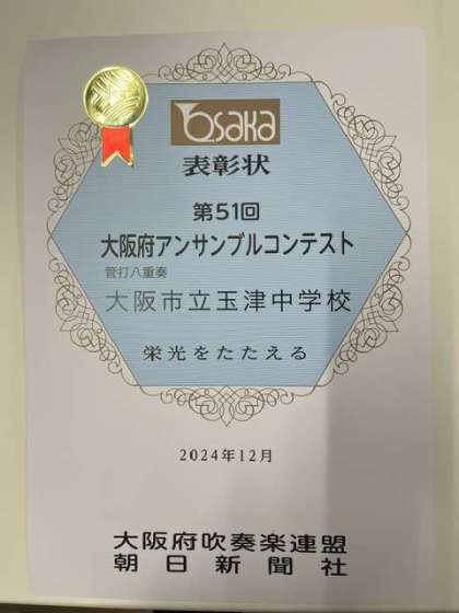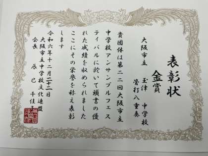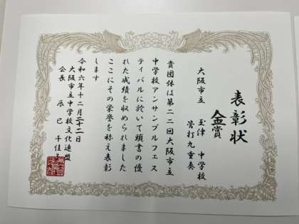 12月に実施された大阪府アンサンブルコンテスト、大阪市立中学校アンサンブルフェスティバルにおいて、金賞を受賞しました。