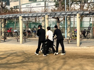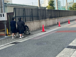 今日は、車いす体験で学校周辺を回ります。
